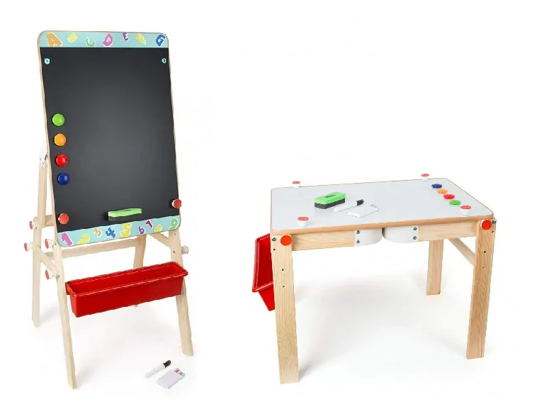 Nielen že má nastaviteľnú výšku a obojstrannou plochu pre písanie kriedou alebo fixky, ale zároveň je aj jej plocha magnetická. Navyše jednoduchým přeskládáním pomocou uťahovacích skrutiek z nej urobíte pracovný stôl opäť s obojstrannými doskami pre písanie kriedou alebo fixky, poslúži k ako klasický detský pracovný stôl!
