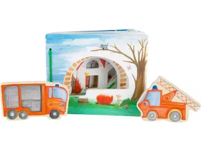 Na každej strane deti nájdu iný obrázok znázorňujúci prácu hasičov, navyše drevené 2 hasičské autá môžu voľne "prechádzať" medzi stránkami. Na konci zábavy je možné ich pripevniť pomocou suchého zipsu na zadnú stranu knižky.
