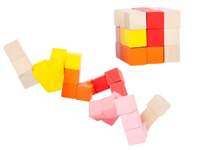 Jednotlivé křevěné kocky sú spojené pevnou gumou, otáčajú sa navzájom okolo sebaa vašou úlohou sa poskladať z nich kocku.
