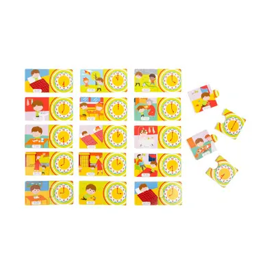 Drevené puzzle s obrázkami rôznych každodenných činností a času. Hravou formou sa deti učia rozpoznávať čas, priraďovať digitálne znázornenie času k času na hodinách, učí sa postupnosti denných činností a aktivít.