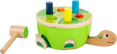 Obľúbená drevená hračka založená na princípe zatĺkania kolíkov.Pri údere sa jeden kolík schová a automaticky ďalší vykukne von, rovnako ako aj korytnačie nožičky.