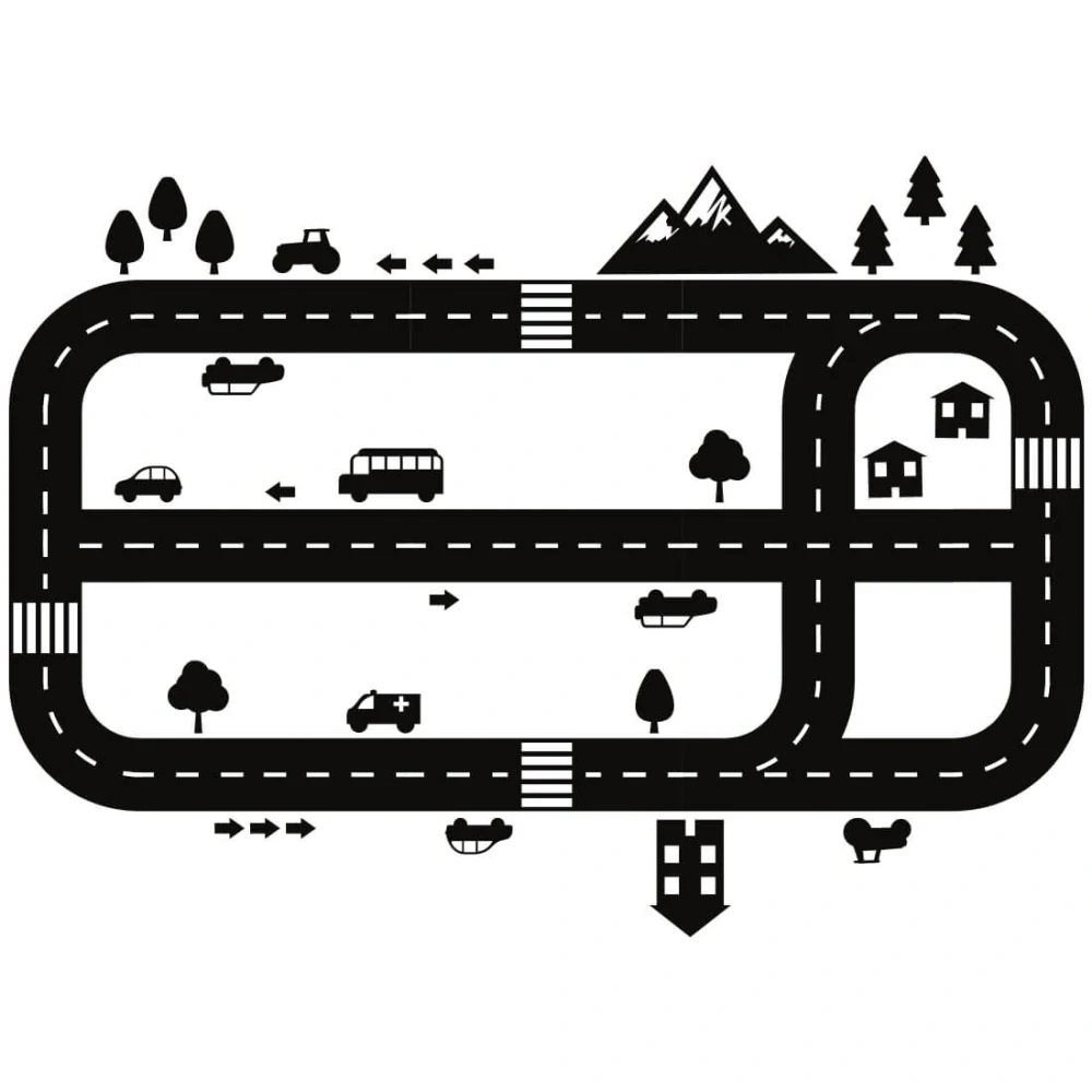 Vymyslené pre miestnosti, v ktorých nie je veľa miesta na rozloženie autodráhy a neustali upratovanie :) Možno nalepiť aj na stenu, nábytok ... Vrátane dekoračných prvkov ako sú stromy, autíčka, šípky a hory.
