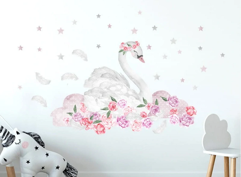 Krásna samolepka na stenu sa labutí s pivonkami, hviezdami a perím, ktoré budú romantickú ozdobou izbičiek malých princezien.