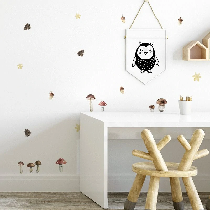Hríbiky, šišky a kvety - originálne samolepky na výzdobu detskej izby, chodby, herne, ....Samolepky je možné doplniť o ďalšie varianty z kolekcie Kamaráti z lesa.